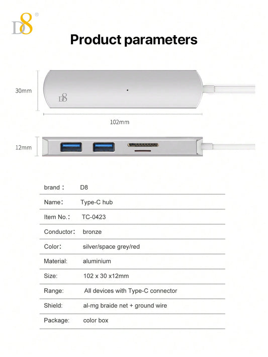 D8 4-in-1 USB C Hub - USB-C, 2 USB A 3.0, SD/TF Reader, 5Gbps, Aluminum Design