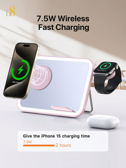 D8 3-In-1wireless Charging,7.5W Wireless Fast Charging,LED Soft Light,Dimmable Ambient Light,Cosmetic Mirror & Night Light,LED Natural Filllight Soft Warm Light, Not Harmful To Eyes