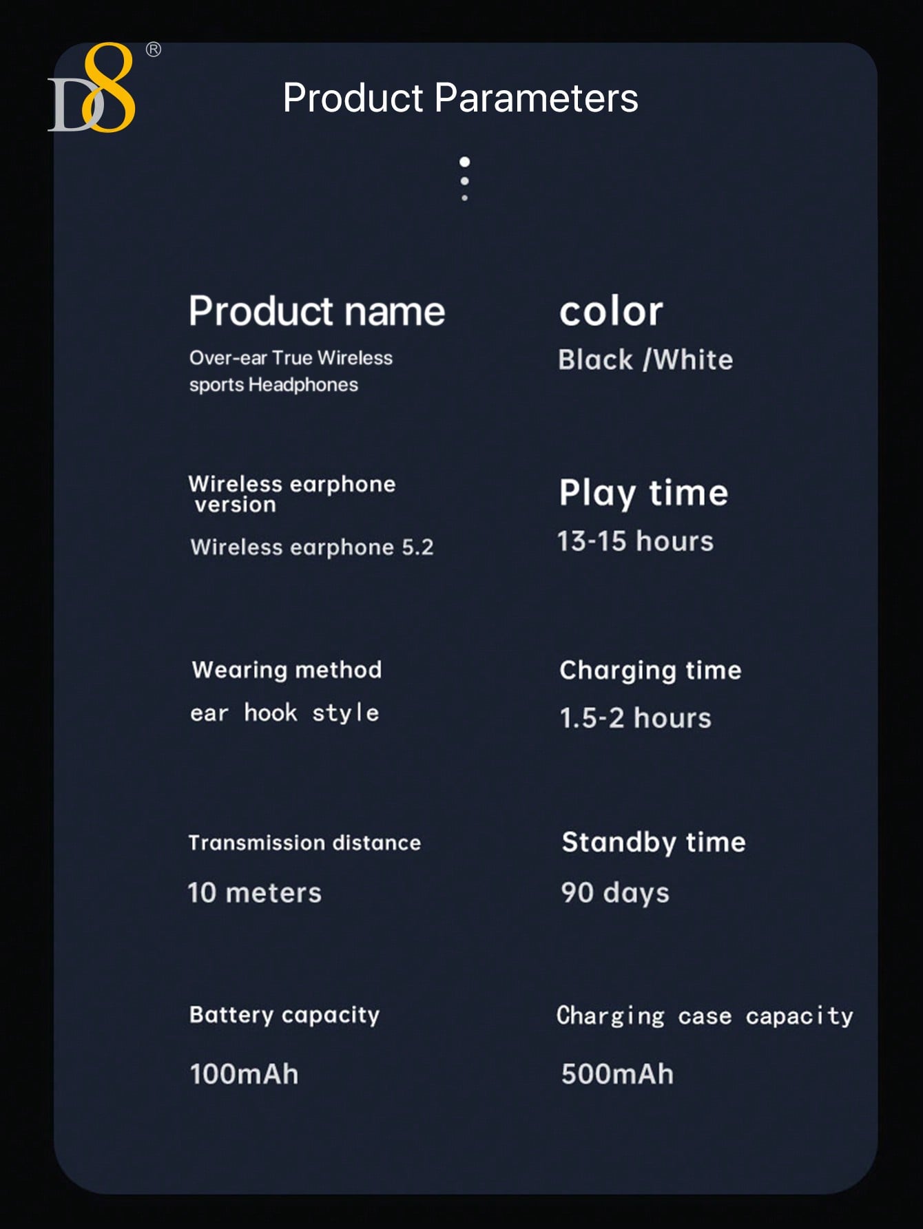 Introducing the D8 Open Ear-Mounted Wireless Sports Headphones, designed to deliver an immersive bass stereo sound experience while keeping your ears open for environmental awareness. With advanced Bluetooth 5.2 connectivity, these wireless earbuds provide seamless pairing and exceptional sound quality. Featuring over-ear hooks, a built-in microphone, and waterproof protection, these headphones are ideal for both intense workouts and outdoor activities. The 15H playback time and wireless charging case ensure you have the power to keep going all day.